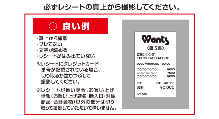 ※レシートは「お買い上げ店名」「ご購入日」「対象商品」「合計金額」が確認できるように撮影してください。 ※レシート画像は3ファイルまでアップロードする事が可能です(1ファイルあたり5MBまで)。